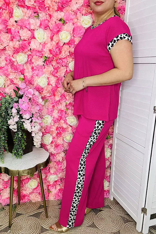Women's clothing wholesale Fuchsia ribbed knitted fabric & leopard prints 2pc sets XCH16118