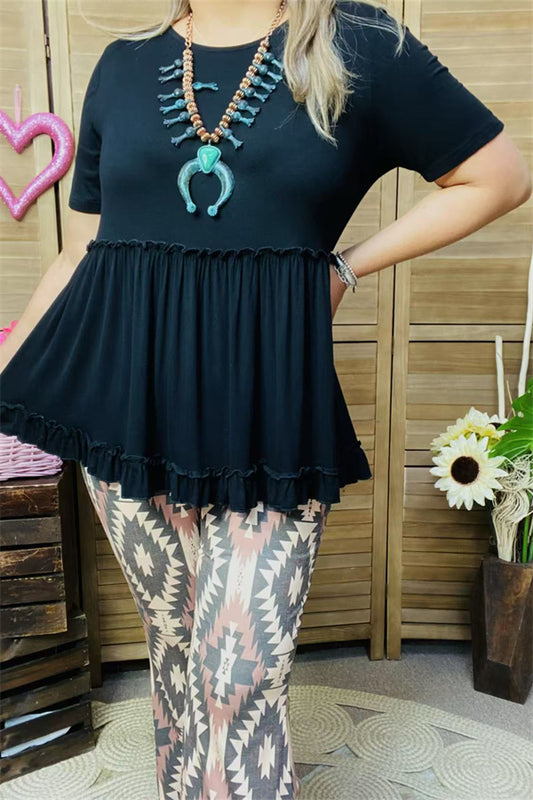 SaleBQ15553 Black short sleeve baby doll women tops w/short sleeve &ruffle bottom