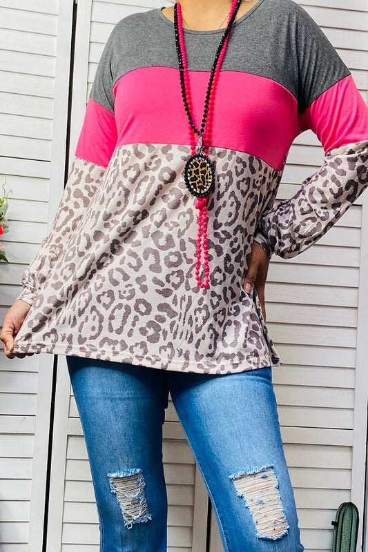 SaleXCH14465 Grey & Pink & Leopard printed color block women top