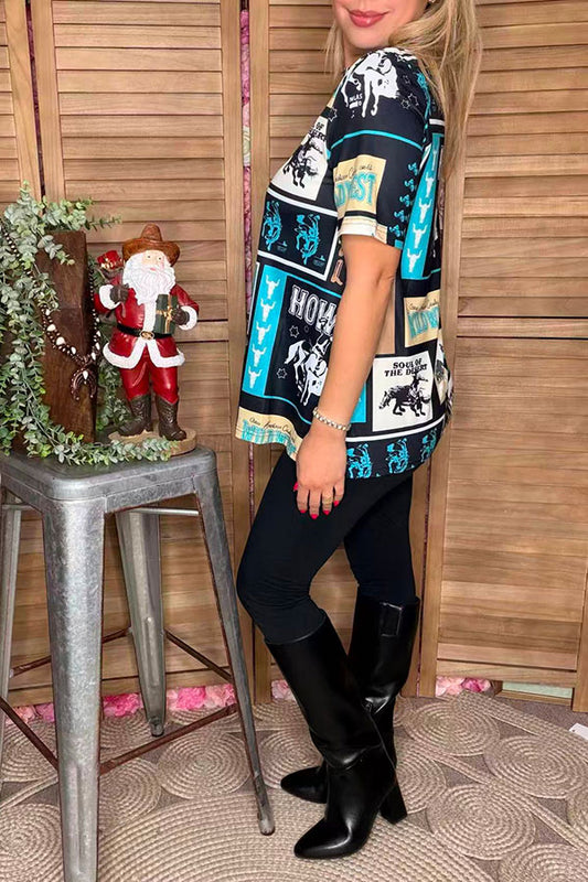 Blue bows printed puff short sleeve women shirts w/v-neckline XCH16669
