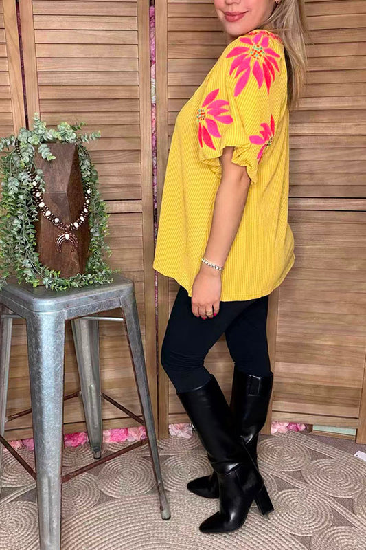 Yellow ribbed knitted fabric pink embroidery puff short sleeves women top XCH16645
