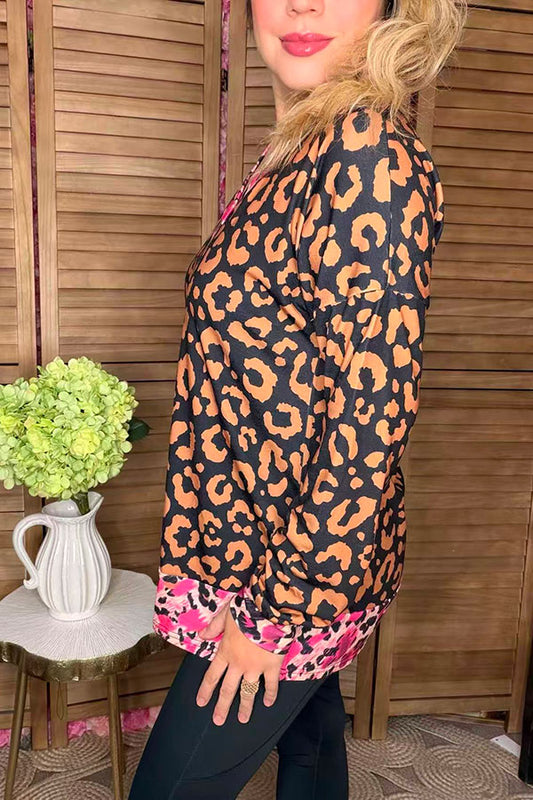 Multi color leopard long sleeve knit black women blouse XCH16655