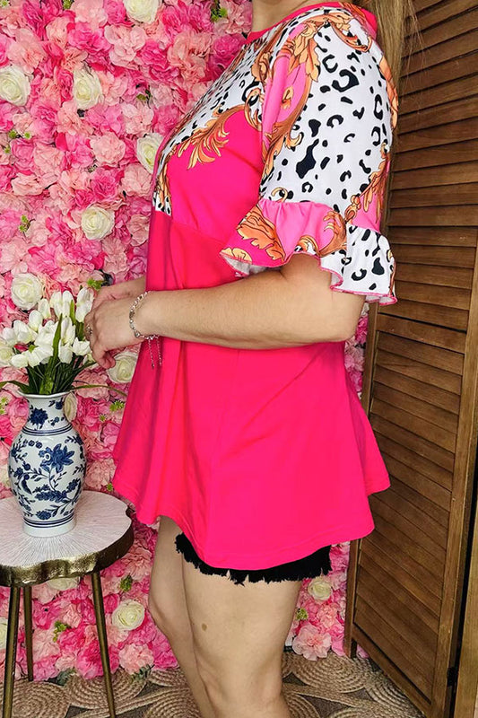 Women's clothing suppliers Western cow & floral printed fuchsia & short sleeves GJQ14900