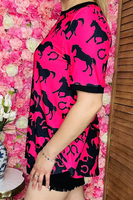 Wholesale women top Half fuchsia & black horse printed w/short sleeves XCH14361
