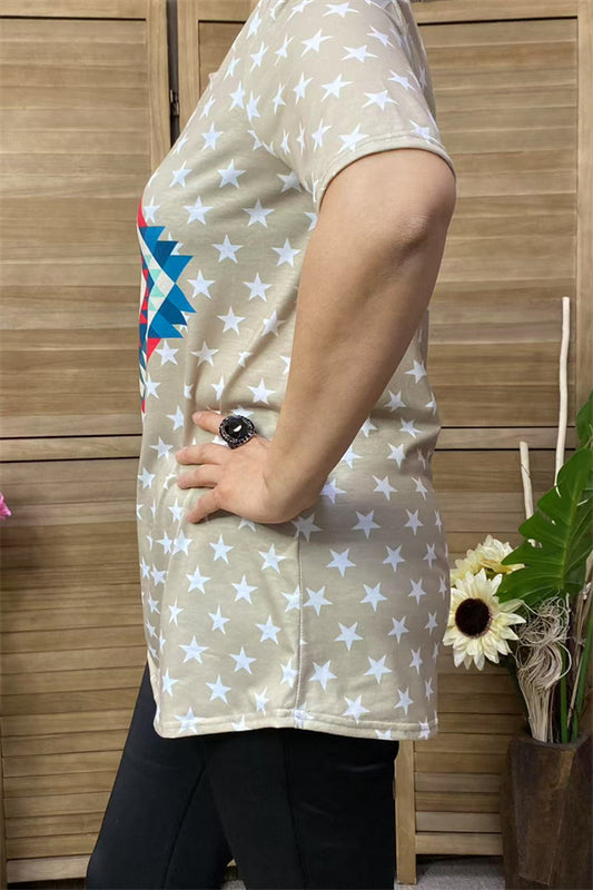 Western t-shirt wholesale Beige star & Aztec printed w/short sleeves DLH12321