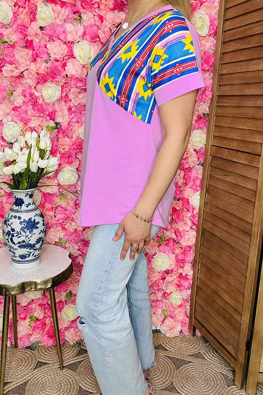 USA women clothing store Purple & Aztec printed short sleeve girls top GJQ10632 (ES13)