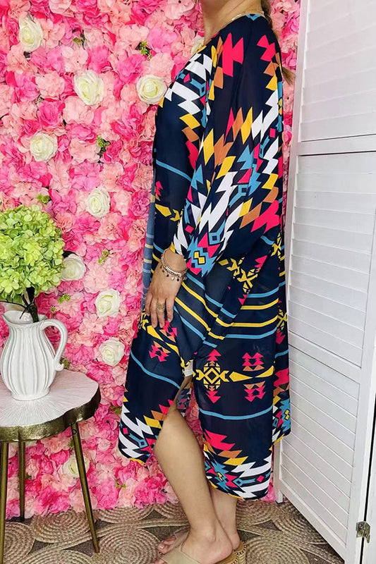 SaleWomen cardigan Aztec striped multi color printed 3/4 sleeves with slits side XCH14545