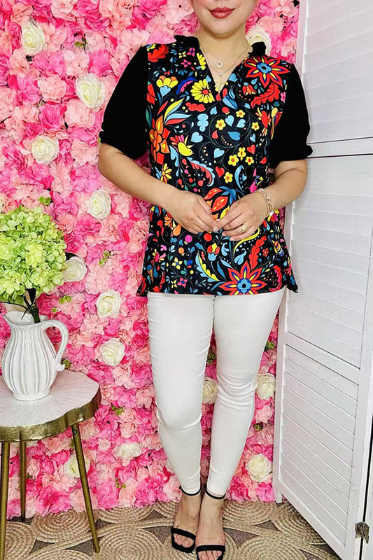 SaleWomen's clothing wholesale floral printed & black short sleeve top BQ15685