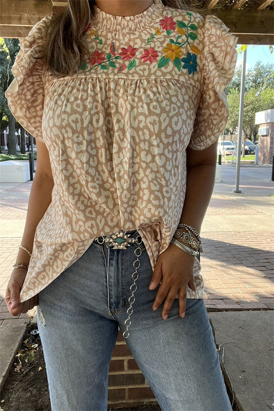 SaleXCH15721 Leopard printed double ruffle short sleeve floral embroidery women beige tops