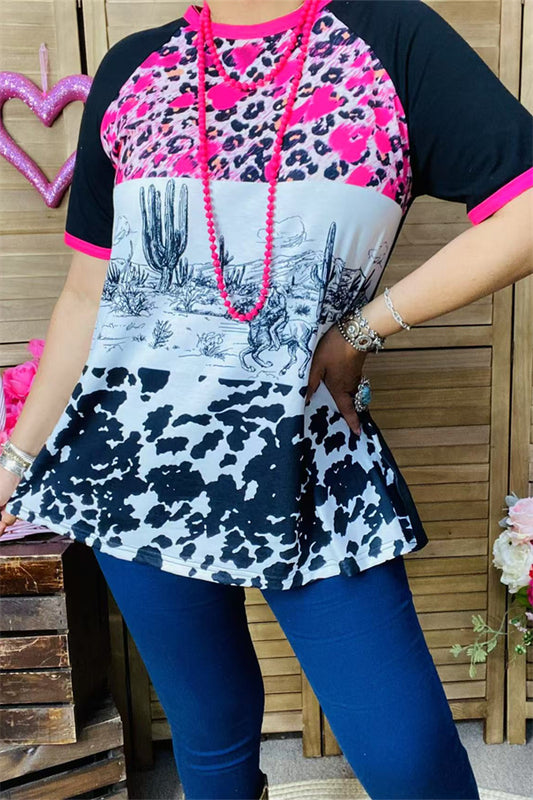 SaleXCH14677 Leopard&Cactus&riding horse & Cow multi color printed black short sleeve women tops