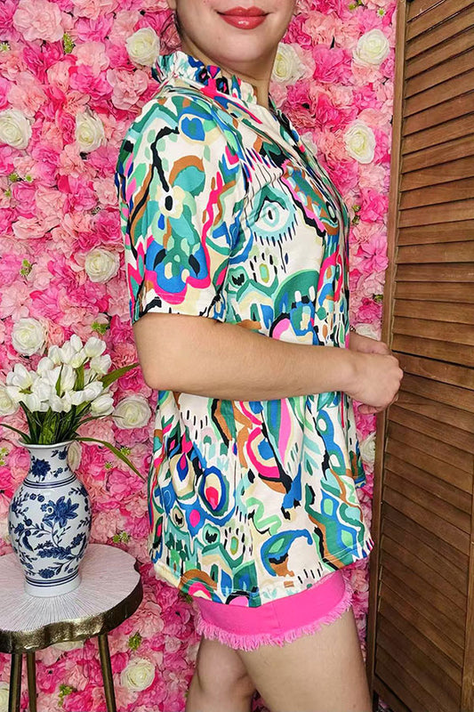 Wholesale women top Pink & orange & blue printed w/ruffle short sleeves XCH16211