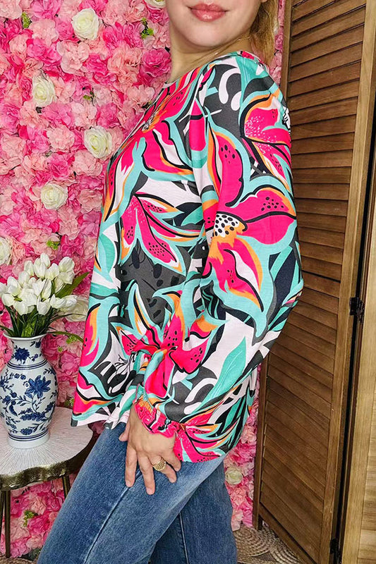 Wholesale fuchsia & Green floral printed puff long sleeve women's blouse GJQ16336