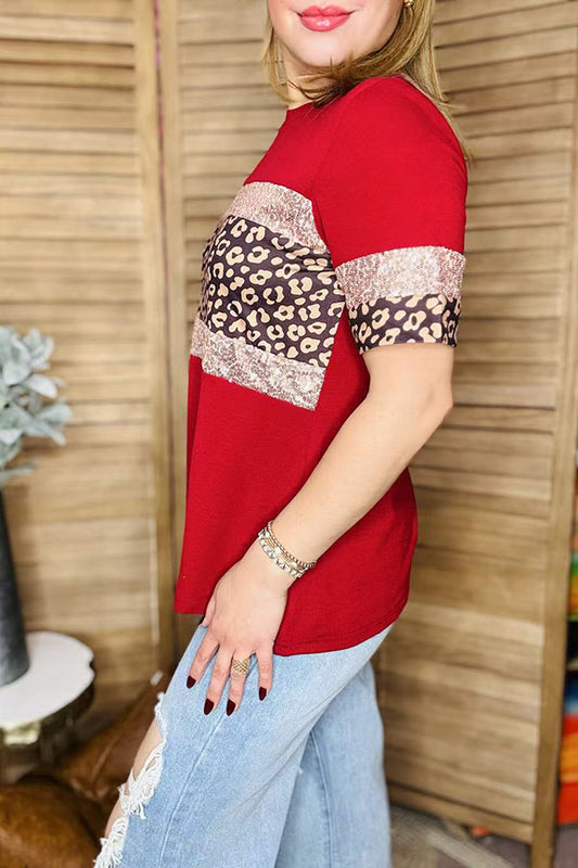Wholesale Red & leopard & sequin color block short sleeve women t-shirt GJQ16250