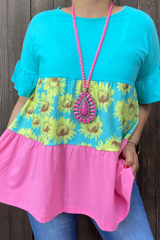 Women top suppliers Turquoise & floral & pink color block with short sleeves XCH14854