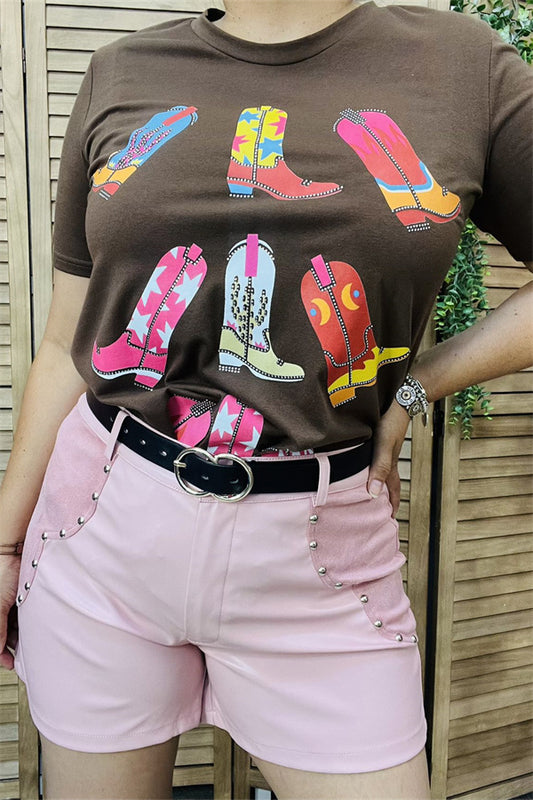 SaleBQ14810 Boots multi-color printed on the taupe fabric short sleeve women tops
