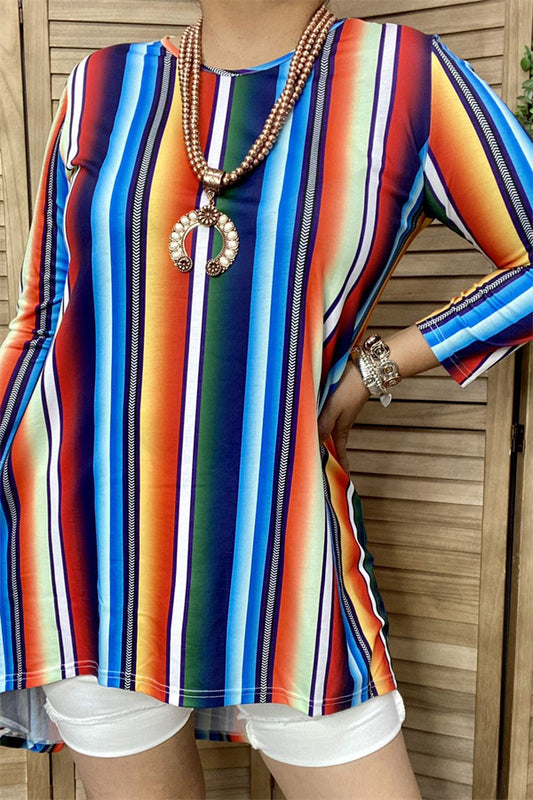 SaleGJQ7807 Colorful stripe front short back long design 3/4 sleeve women tops