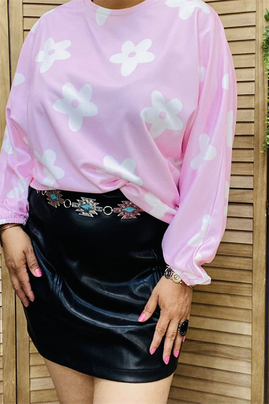 SaleBQ15377 White floral printed baby pink background fabric long sleeve women loose blouse