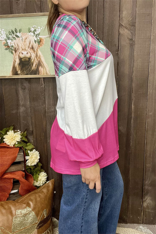 SaleXCH15251 Colorful checked fuchsia&white block printed long/tighten cuff sleeve women tops