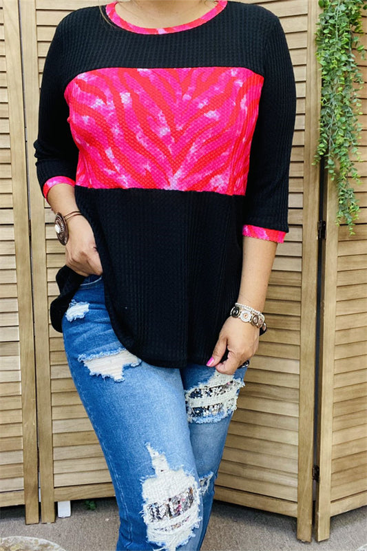 SaleXCH15332 Fuchsia printed black block knitted material 3/4 sleeve loose women blouse