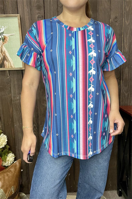 FW10191 Multi color Aztec/Cowboy printed short sleeve/ruffle women blouse (DS4)
