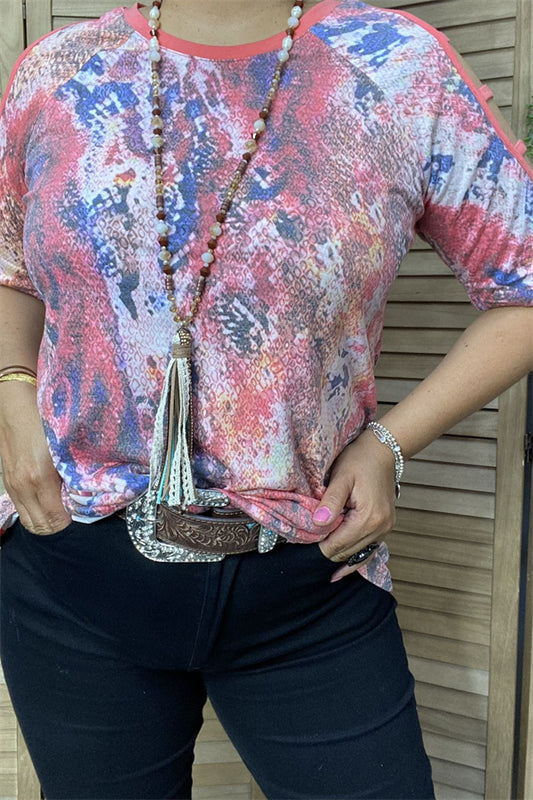GJQ9431 Multi color Snake printed top w/ cold shoulder sleeve