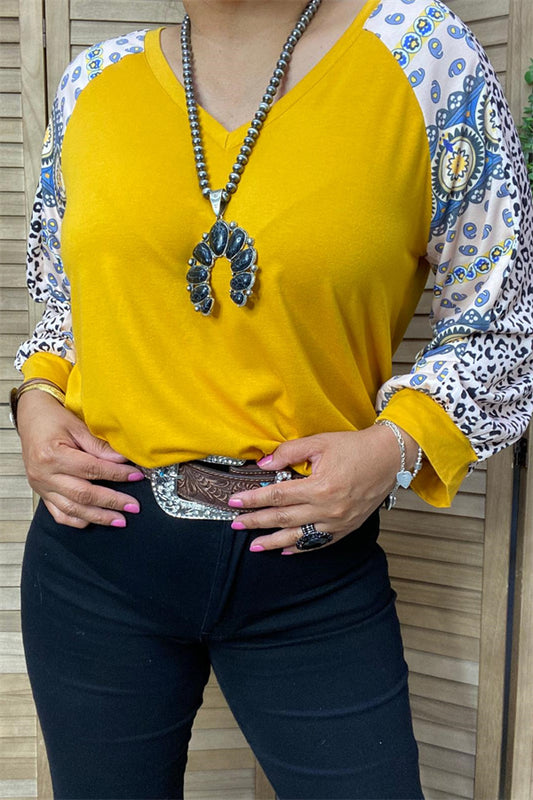GJQ13086 Yellow mustard blouse raglan w/ 3/4 leopard printed sleeves (DS8)