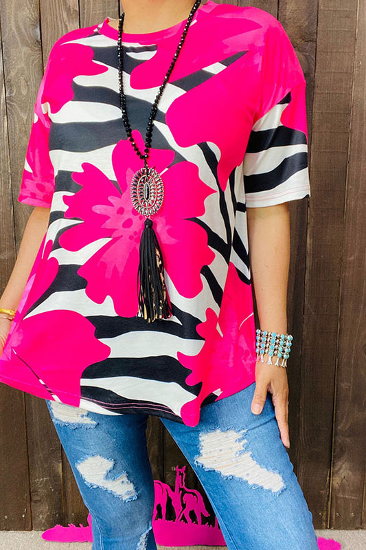 SaleXCH14889 Fuchsia flower & zebra prints short sleeve women top