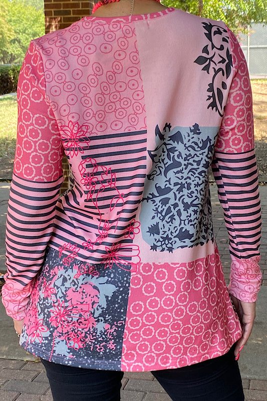 XCH13959 PINK PAISLEY TOP WITH LEOPARD LONG SLEEVE