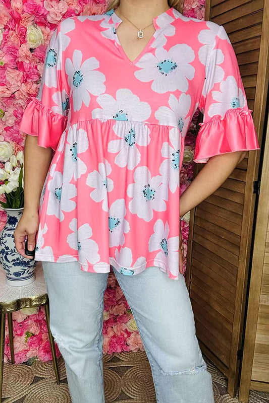 Women clothing suppliers Pink floral printed ruffle loose blouse GJQ16137