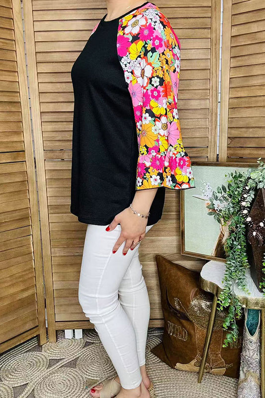 SaleWomen t-shirt wholesale Floral sleeve & black body top YMY15382