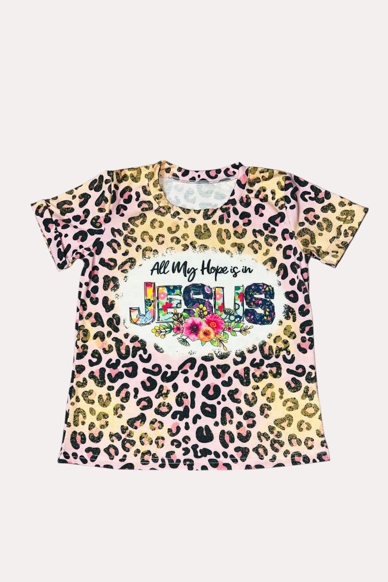 Top features "All my hope is in JESUS" wording with flowers around logo on a animal print back ground.