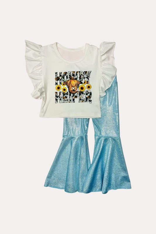- Add some style to her look with this fashionable bell bottoms. Good to match with any top from short to long sleeve. The shinny color adds a cute & fun touch to her wardrobe.