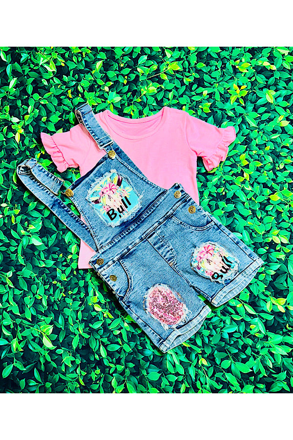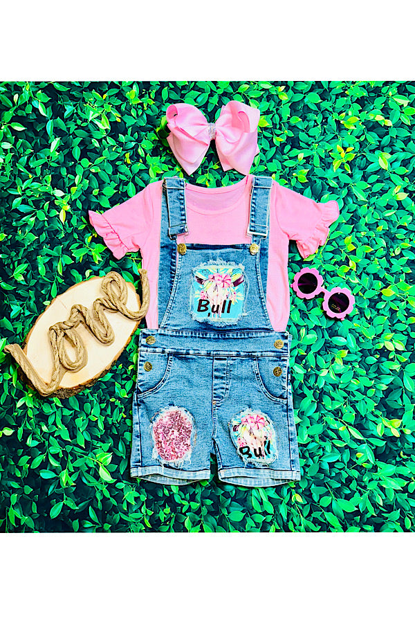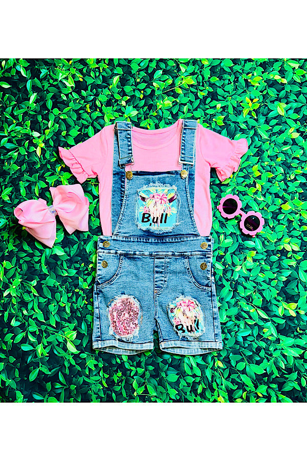 - Overalls feature light wash denim w/pink sequin & "BULL" patch on legs.