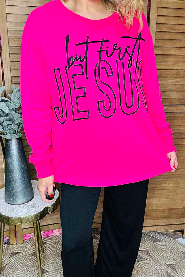 Top features "but first JESUS" embroidery on hot pink background with long sleeves.