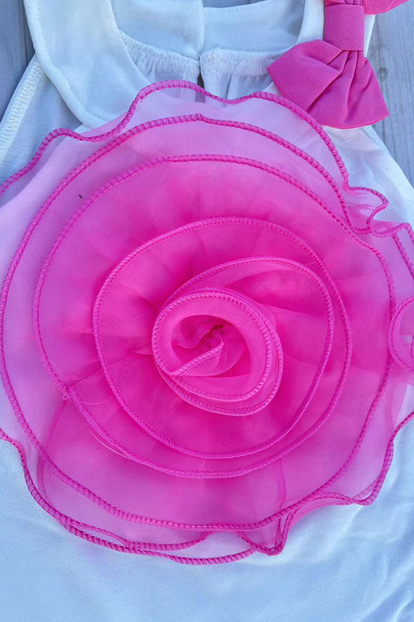Top features with pink rosette at the chest & halter collar & pink bow.