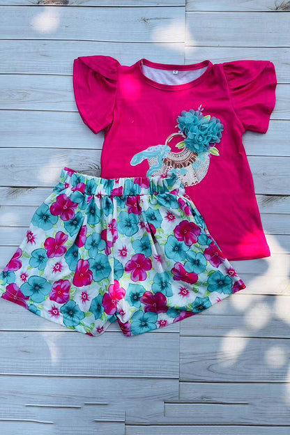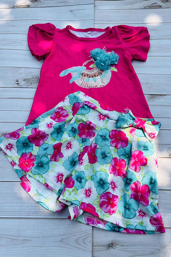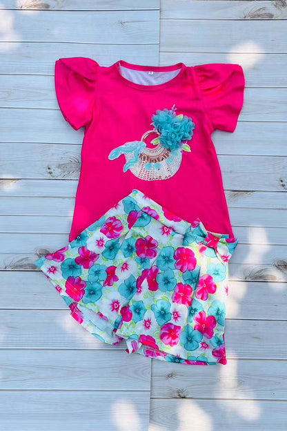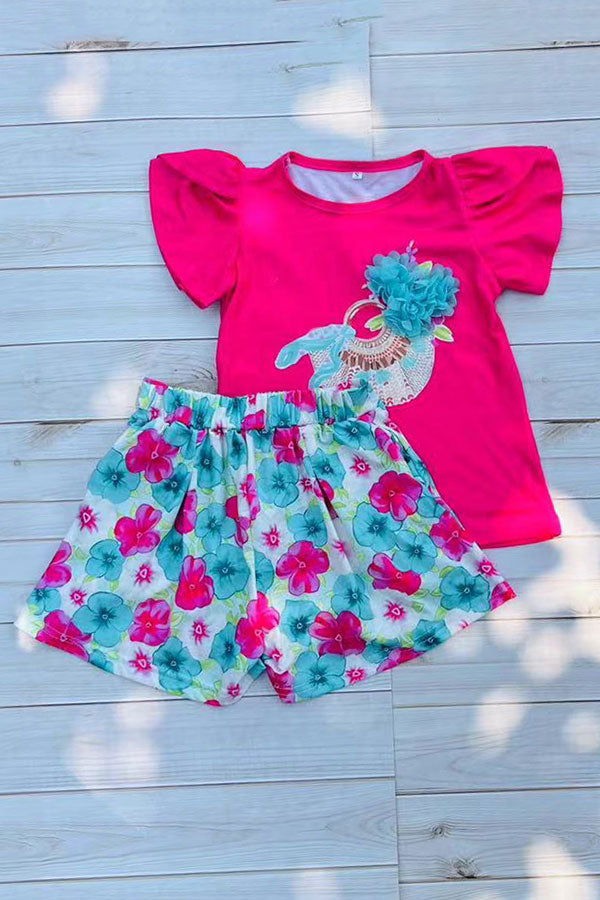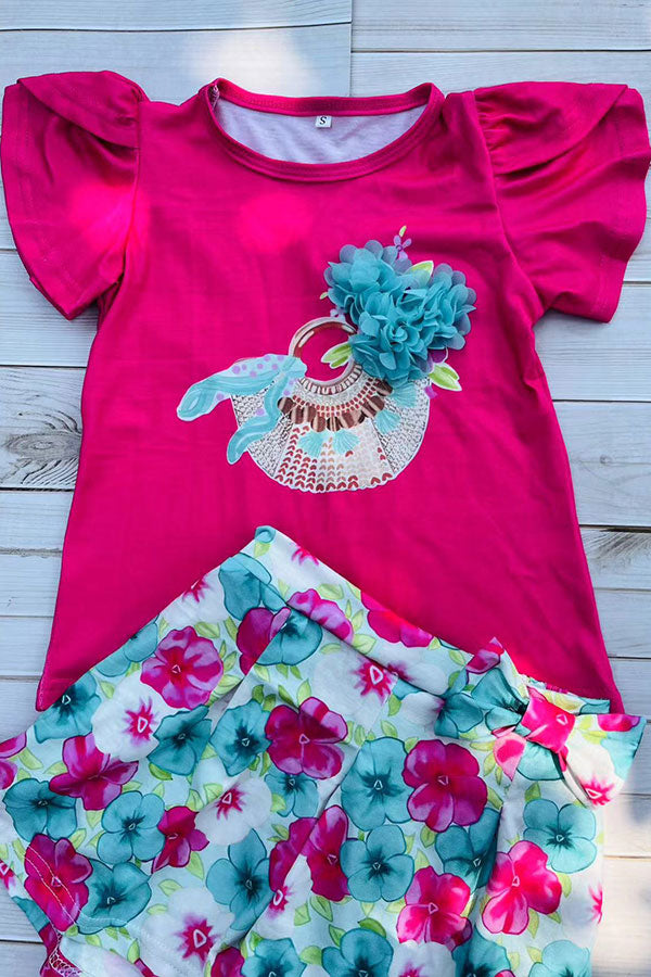 childrens clothing sets wholesale Fuchsia top & floral prints shorts 2pcs girls sets DLH2873