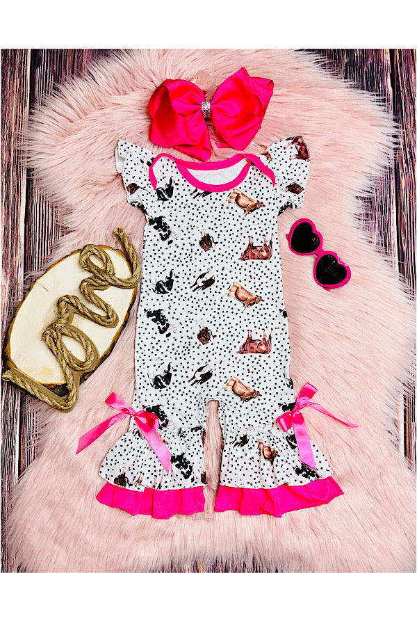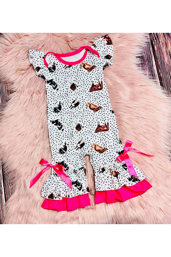 - Romper features cows & black polka dots print on white background w/hot pink ruffles & short sleeve cut.