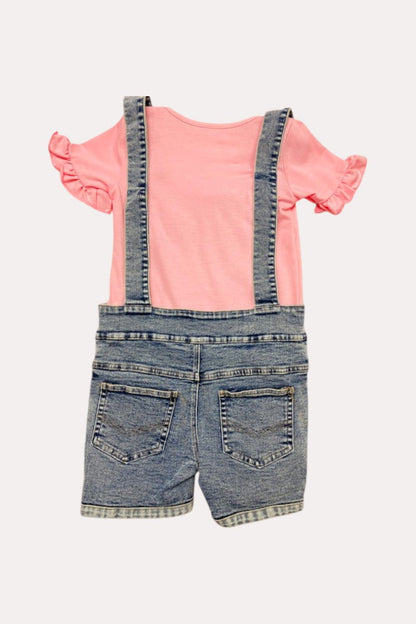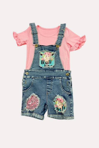 D2483 Bull horn denim romper w/patches includes pink top 2pcs girl set