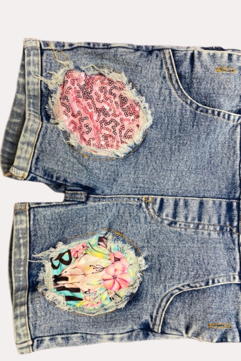 Bull horn printed with bull & pink sequin patches denim romper to match the top as a set.