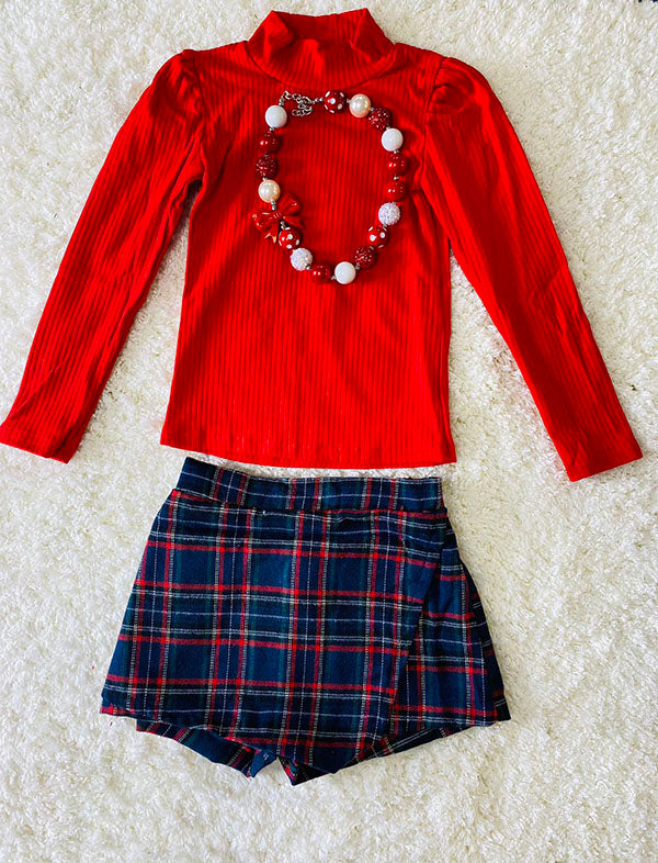 D2701 Red long sleeve top green/blue/red plaid skirt/shorts girls sets