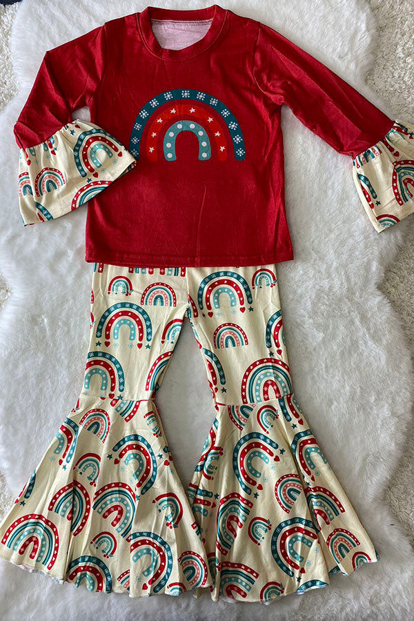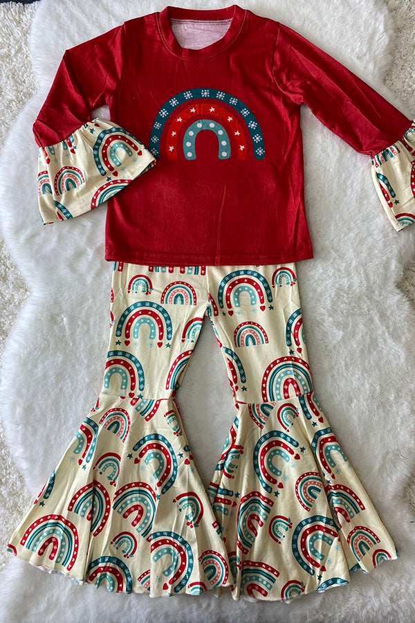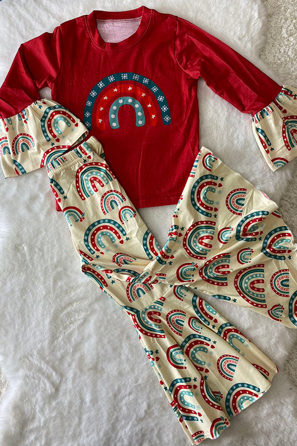 - Get ready for Christmas cartoon print bell-bottom girls set. This long-sleeve top features a cartoon print on the front that looks cute with flared pants. The elastic waistband aids in comfort and fit, perfect for Christmas. The top and trousers can be combined as a set, paired with our bow, or keep it casual with a pair of boots, she'll sparkle in this kid's outfit.