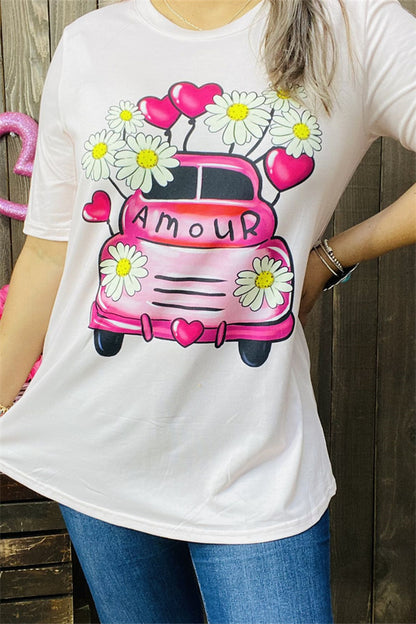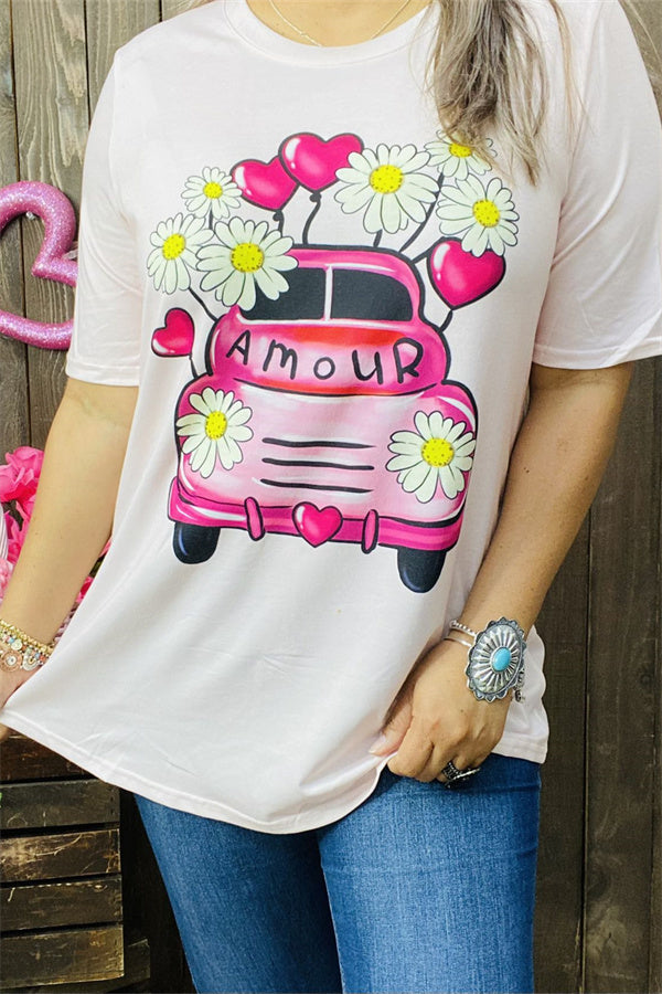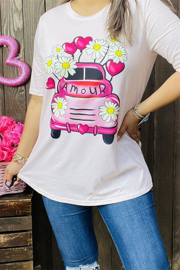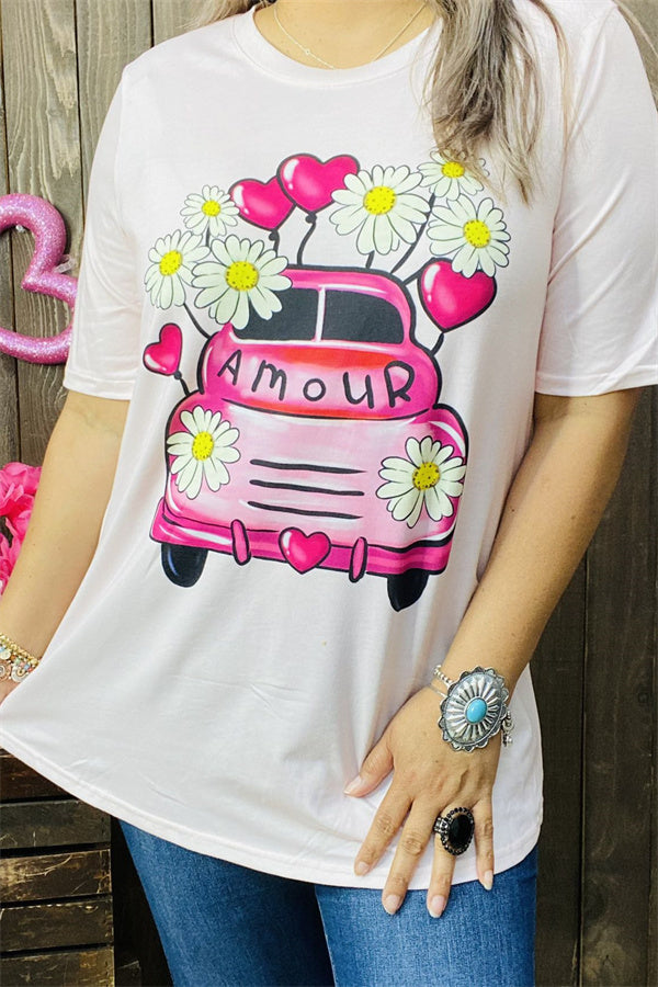 DLH13526 "A mouR"&fuchsia car/heart/sunflower multi color printed short sleeve women pink tops