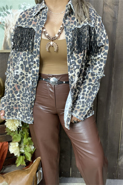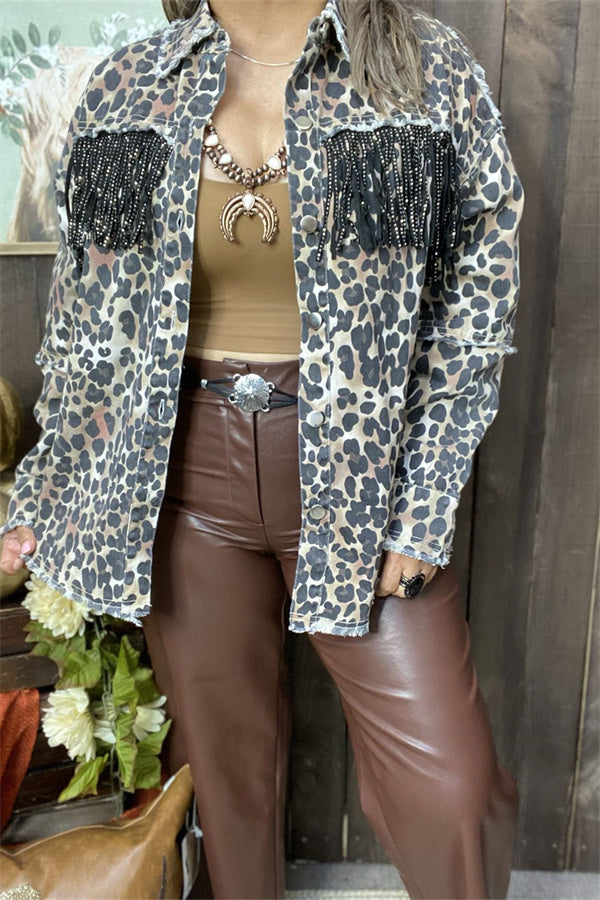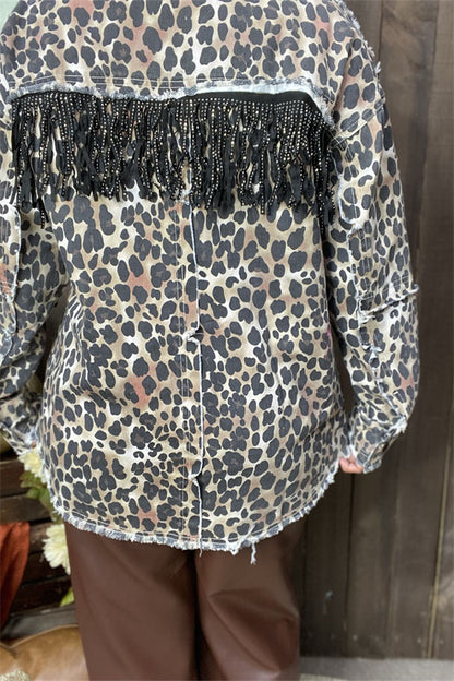 Top features Leopard printed with front&back rhinestone black tassel/fringe long sleeve women coat/jacket
