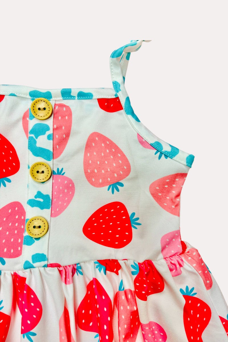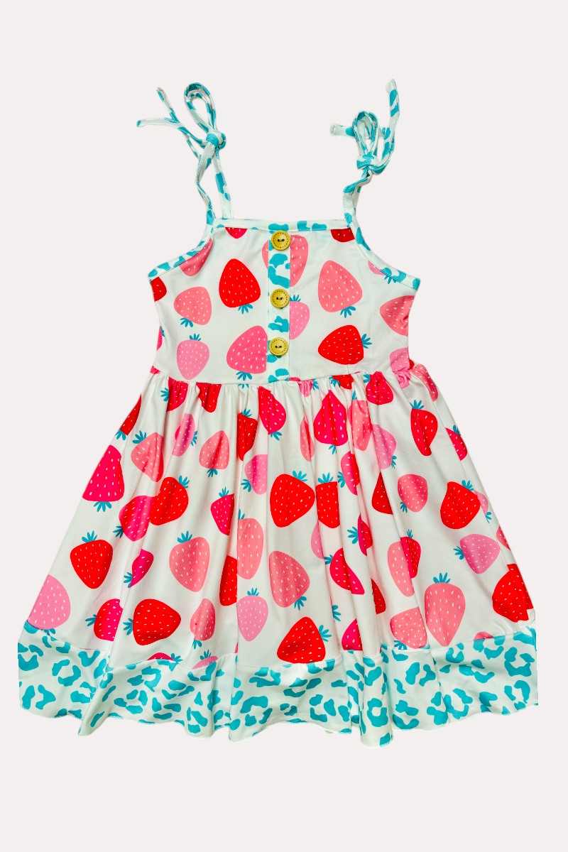 - Dress features with pink strawberry printed on white background with turquoise leopard ruffle hem and strapped, with buttons.