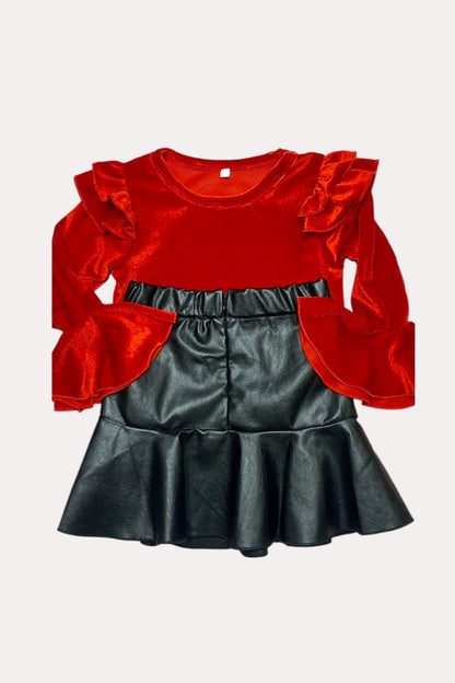 - Top features with solid color red velvet ruffle at shoulder/sleeves.