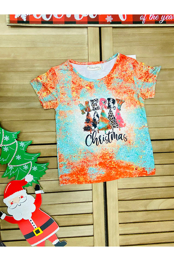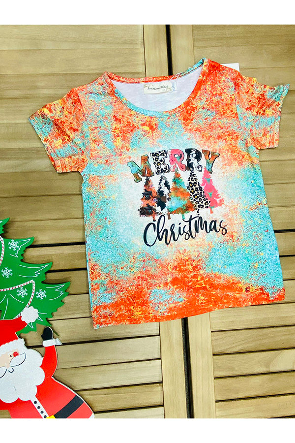 - Top features “Merry Christmas" & Multi-color trees print on a orange/teal tie dye background in short sleeve t-shirt cut.