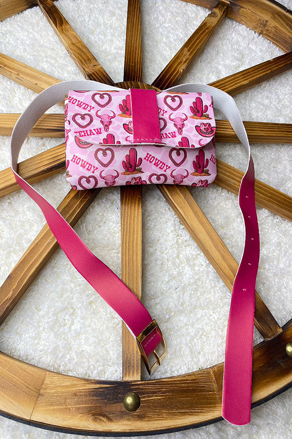 - Bag in HOWDY & bull & cactus prints on pink background with match belt.