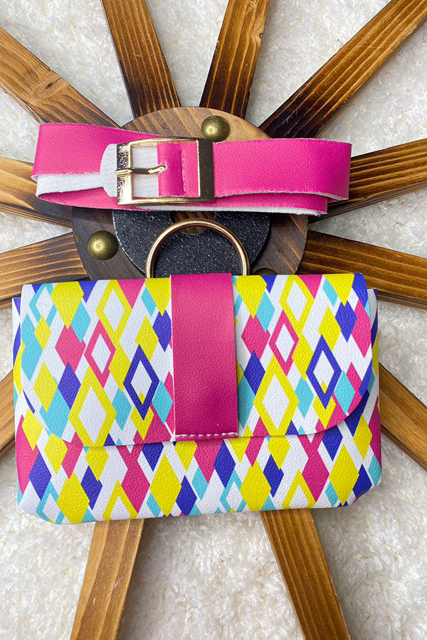 - Bag in multi color diamond prints on white background with match belt.