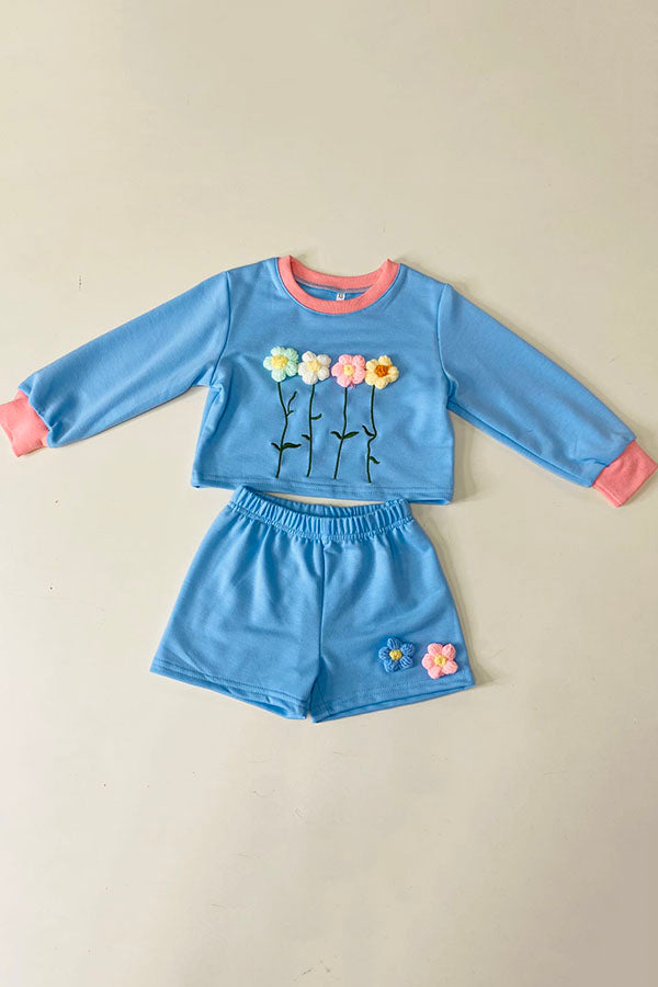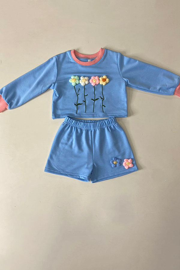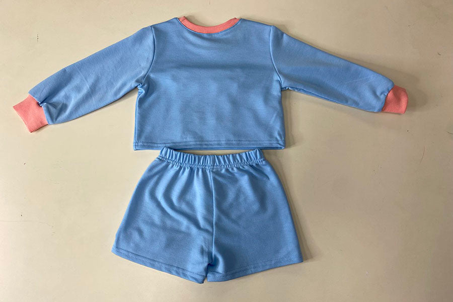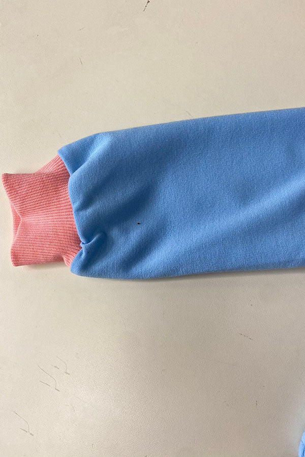 The top features solid color blue with short style cuts & flower embroidery & pink collar and cuff.