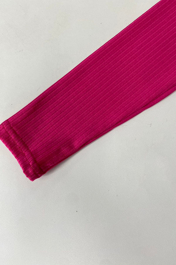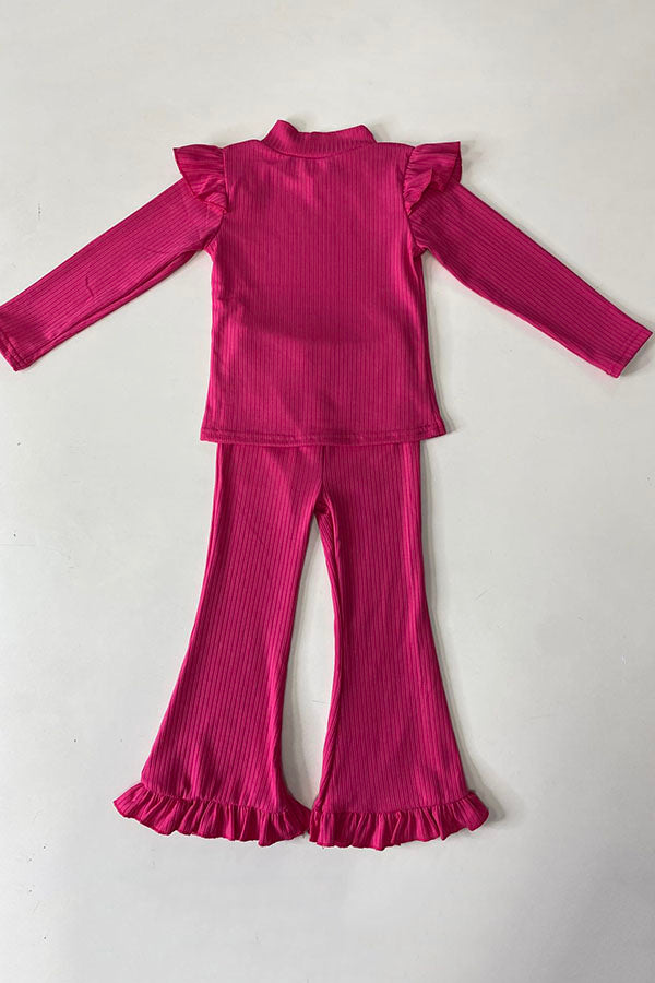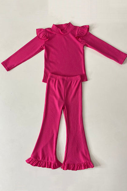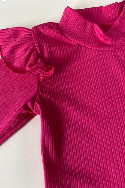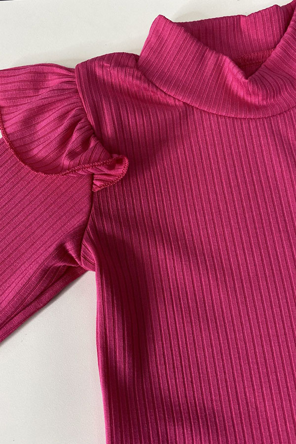 The top features solid pink knitted fabric with ruffles & long sleeves.